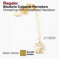 Colgante con forma de herradura, con una cabeza de caballo en el centro.Dorado.Se suministra en un estuche.Largo de la cadena de 46 cm.