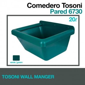 Comedero para pared.Fabricado en plástico.Con tapón en el fondo para una mejor limpieza.Capacidad: 20 litros.Color: Verde.
