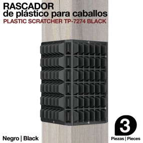 Para fijar en la pared y que los caballos se puedan rascar.Fabricado en plástico.Se suministra un conjunto de 3 piezas.Color: Negro.