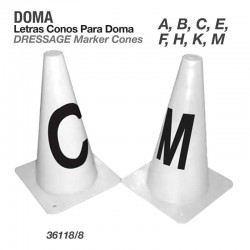 Letras con conos para doma rígidos.Se compone de ocho conos identificados con letras (A, B, C, E, F, H, K, M).Se pueden fijar al suelo.Color: Blanco.
