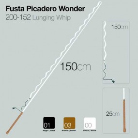 Fusta de picadero de 170 cm y 195 cm de latiguillo.Fabricada en fibra de vidrio.Mango de goma de 25 cm.Color: Blanco, Negro, Marrón.