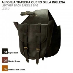 Fabricada en cuero suave y flexible.La alforja se cierra mediante una hebilla con coscojo.Se ajusta a la silla mediante dos correas de cuero con una hebilla con coscojo.Medida de cada alforja: 32...