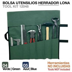 Bolsa para mantener los utensilios de herrador ordenados y protegidos.Fabricada en lona.Dispone de varios compartimentos.Cierre con correas de nylon. Colores: Verde, Azul.Herramientas no incluidas.