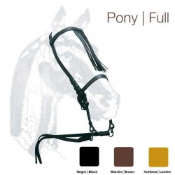 Cabezada de montar con doble rienda.Fabricada en cuero.Frontalera y muserola alomadas.Hebillaje cromado.Tamaños: Pony (Pequeño), Cob (Mediano), Full (Grande).Colores: Negro, Marrón, Avellana.