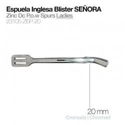 Espuela para señora.Gallo de 20 mm.Sin ruleta.Incluye correa de nylon.Fabricada en zinc inoxidable.Modelo disponible con gallo de 35 mm. (ref. 2103810) y con gallo de 10 mm. (ref. 2103812).