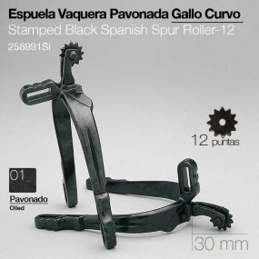 Espuela vaquera.Gallo curvo de 30 mm.Con ruleta inglesa.Sin correas.Fabricada en metal.Color: Negro.