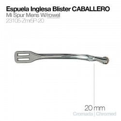 Espuela para caballero.Gallo de 20 mm.Con ruleta.Incluye correa de nylon.Fabricada en zinc inoxidable.Modelo disponible con gallo de 40 mm. (ref. 2103807) y con gallo de 10 mm. (ref. 2103809).