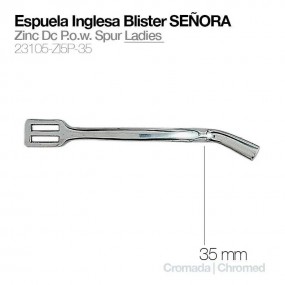 Espuela para señora.Gallo de 35 mm.Sin ruleta.Incluye correa de nylon.Fabricada en zinc inoxidable.Modelo disponible con gallo de 20 mm. (ref. 2103811) y con gallo de 10 mm. (ref. 2103812).