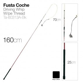 Fusta de picadero de 180 cm y 217 cm de latiguillo.Con mango de goma de 24 cm.Se desmonta para un mejor transporte.Color: Negro.