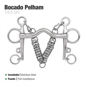 Pierna: 13.5 cm.Portamozos: 6 cm.Grosor embocadura: 17 mm.Con barbada.3 pasadores para rienda.
