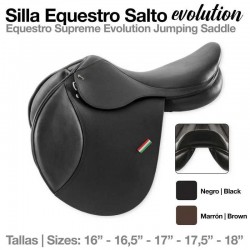 2068 - SILLA EQUESTRO SALTO EVOLUTIONSilla de salto con diseño italiano, fabricada en cuero crupón francés, siendo el armazón italiano de poliéster con refuerzo de acero inoxidable y estribera de...