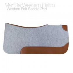 Mantilla fabricada en fieltro para silla Western.Fieltro de 2 cm. de grosor.82 cm. de largo x 72 cm. ancho.Color: Gris con el refuerzo de cuero en Tostado.