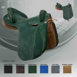 Silla tradicional española, que se usa para preparar los potros a la doma vaquera.MATERIALES:* Asiento de goma látex.* Faldón estilo inglés.* Baste relleno de lana.* Armadura fabricada en...